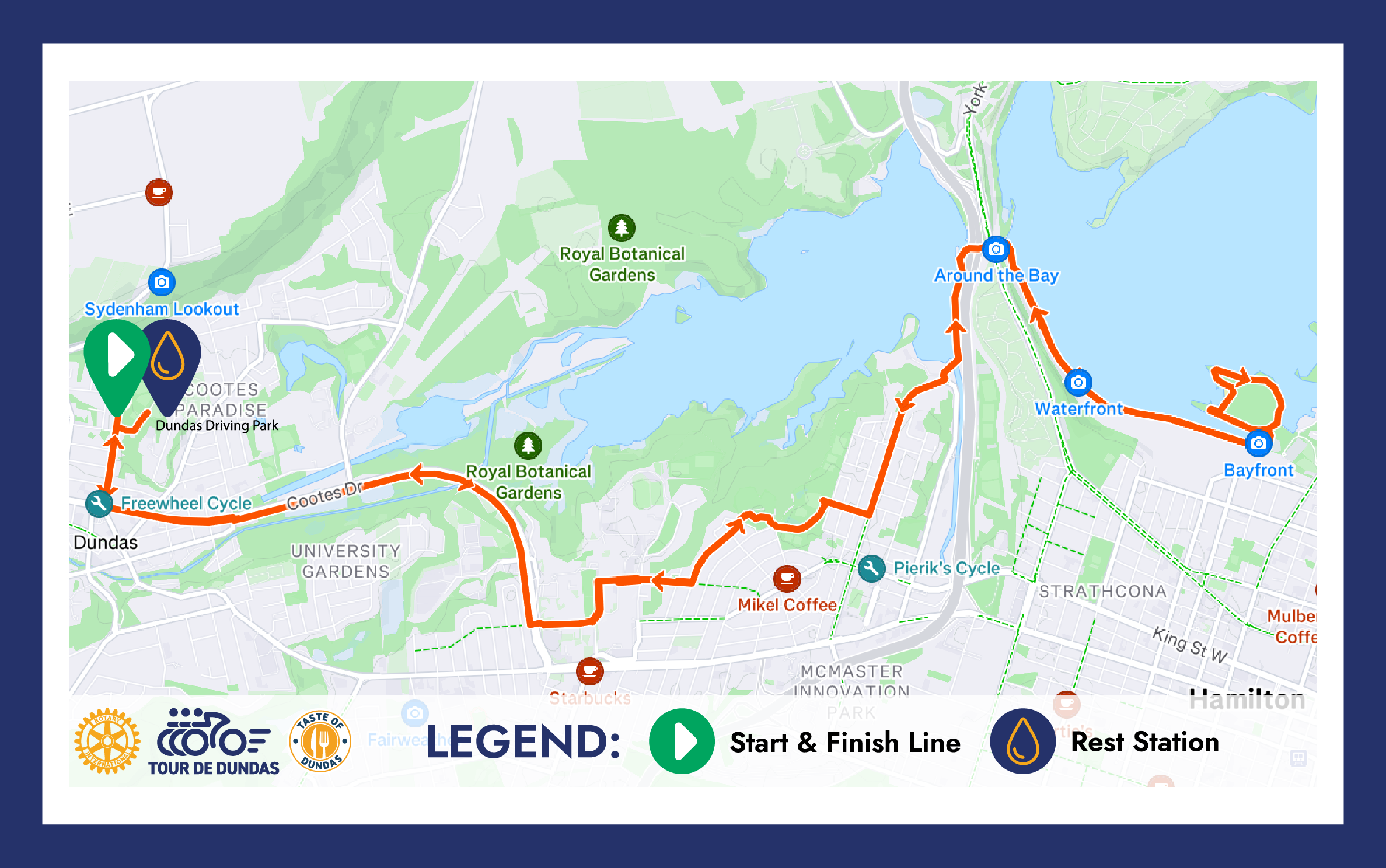 Well-stocked rest stations with water, snacks and toilets are spaced at appropriate intervals. Rest station locations include: Sheffield Community Centre, Carlisle Conservation Area, Flow State Bike & Coffee, and in the Rockton area.